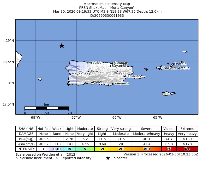 | ESTIMATED MAXIMUM INTENSITY: | IV in Aguadilla, PR |