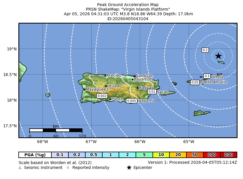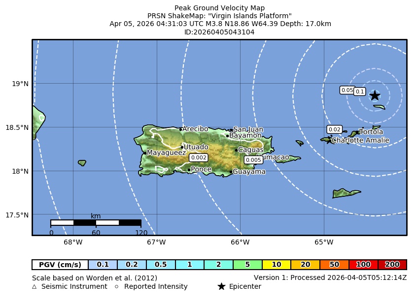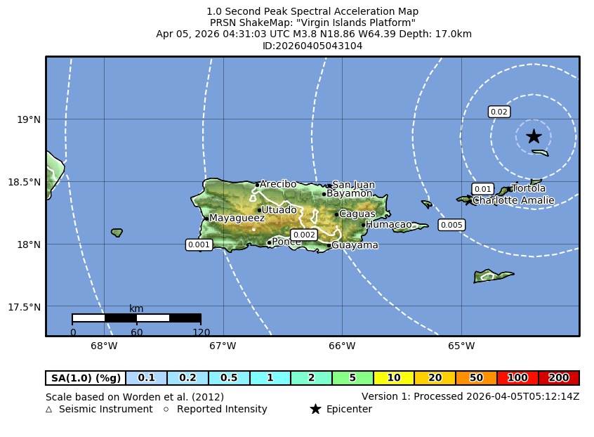 no se han reportado daños y no se espera que ocurran En base a la magnitud, localización y registros históricos, no se espera la generación de un Tsunami destructivo para Puerto Rico e Islas Vírgenes. |